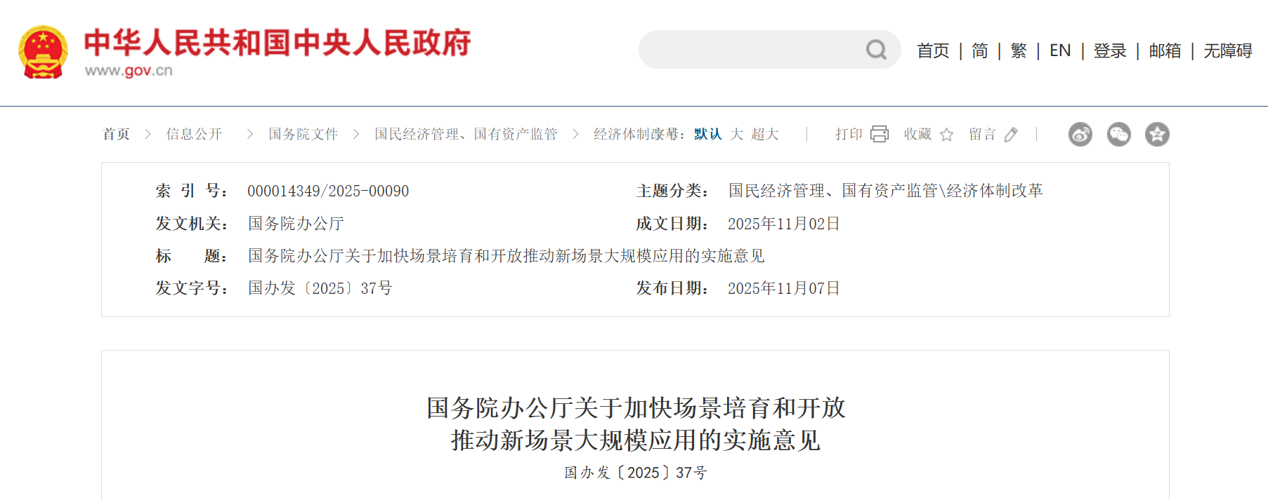 - 11-082025 《關于加快場景培育和開放推動新場景大規模應用的實施意見》發布